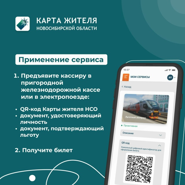 Оформить проездной документ по предъявлению QR-кода в пригородных железнодорожных кассах или в электропоездах можно в рамках нового сервиса «Льготный экспресс» в «Карте жителя НСО». Наличие транспортного требования в бумажном виде не требуется, его заменяет QR-код.